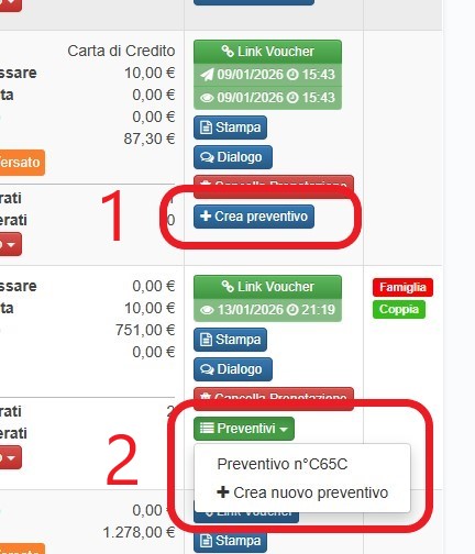 Una volta generato il primo preventivo, il tasto diventerà verde. Cliccandoci sopra, aprirai una tendina dove potrai visualizzare tutti i preventivi associati a quella prenotazione o crearne di nuovi.